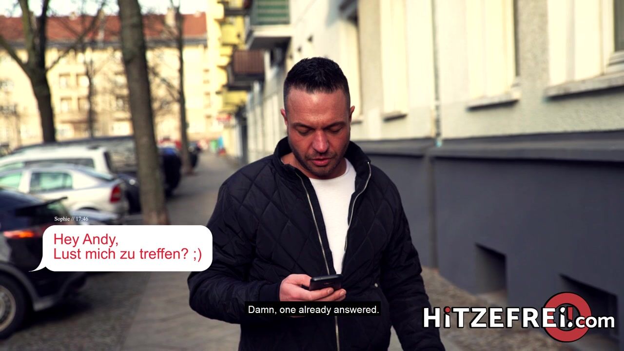 Andy met his old pal Pint who recommended him to register on hitzefrei.dating to get some hot chicks. Once Andy has signed up, he starts chatting with horny MILF Sophie. After a little chit-chat she shows up at his place and the two enjoy a glass of champagne. Sophie is already horny and craving for Andy’s cock. She gives him a blowjob and he realizes that she’s got lots of experience in doing