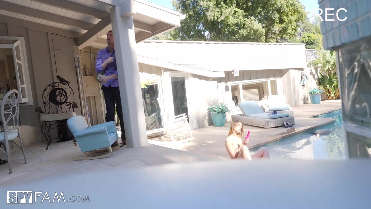 Step daughter catches her step dad spying on her while she masturbates in the backyard.