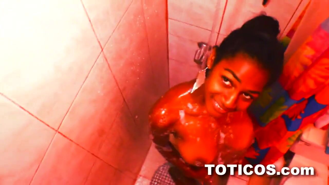 Tiny Dominican babe with unusually large rock hard tits showering on camera